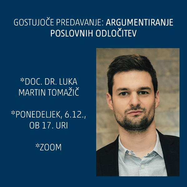 V ponedeljek, 6. decembra, ob 17. uri, v okviru študija Management poslovnih sistemov vabimo na predavanje doc. dr. Luke Martina Tomažiča, kjer bo gostujoči predavatelj predstavil uporabnost in prepletenost konceptov retorike, dialektike in logike pri poslovnem odločanju. Obravnaval bo dva uveljavljena modela sprejemanja poslovnih odločitev, in sicer harvardski pristop študije primerov in pristop Londonske šole ekonomike.