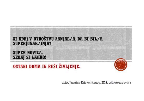 Kako preživljate dneve doma❓ Čakate “da mine” ali so tudi dnevi doma polni življenja❓ Kot pravi asist. Jasmina Kristovič, navodila kako »ostati doma«, živeti in ne samo preživeti, temeljijo na Franklovi teoriji treh vrednostnih kategorij, ki so smerokaz za kakovostno življenje. Pomembno je, da je vsak dan sestavljen iz: