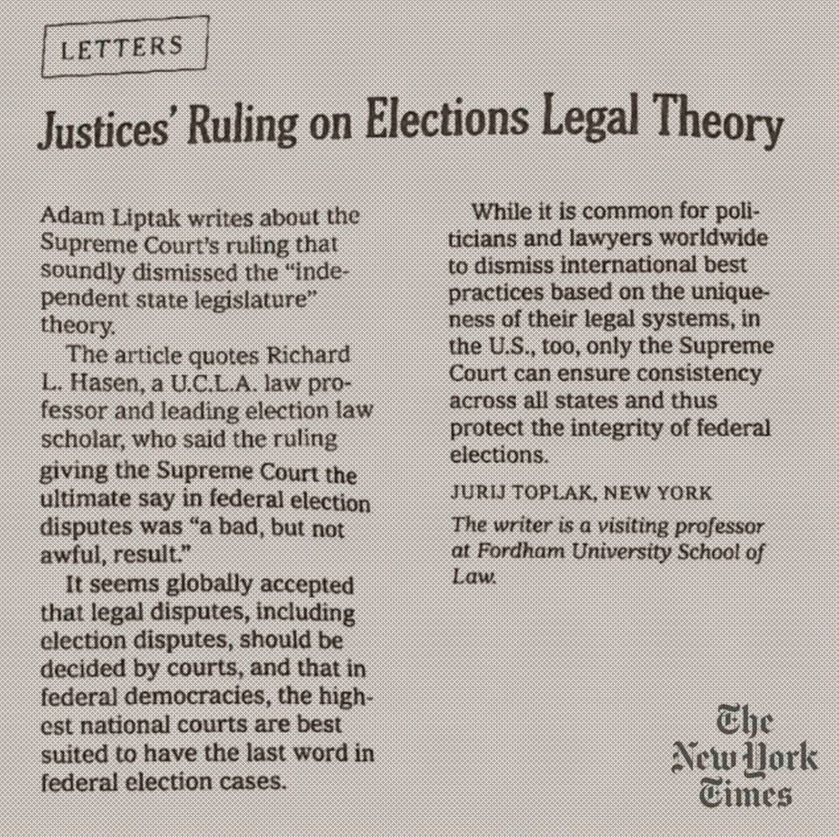 Profesor Toplak je v New York Times sodbi pritrdil s stališčem, da je Vrhovno sodišče "najprimernejše za odločanje o sporih na federalnih volitvah". Poudaril je, da je sodba skladna tudi z mednarodnimi standardi.
